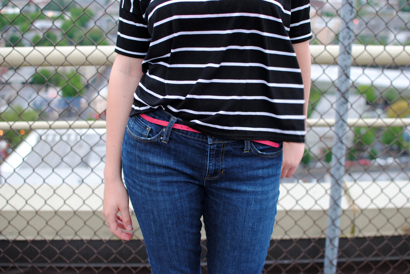 I really love this flowy tee. Normally I go for more fitted tops - I'm so curvy that most of my clothes need to have definition around the waist. But I couldn't resist this top. It's striped and cost $9 - that alone sold me on it. But it turns out it looks good too.